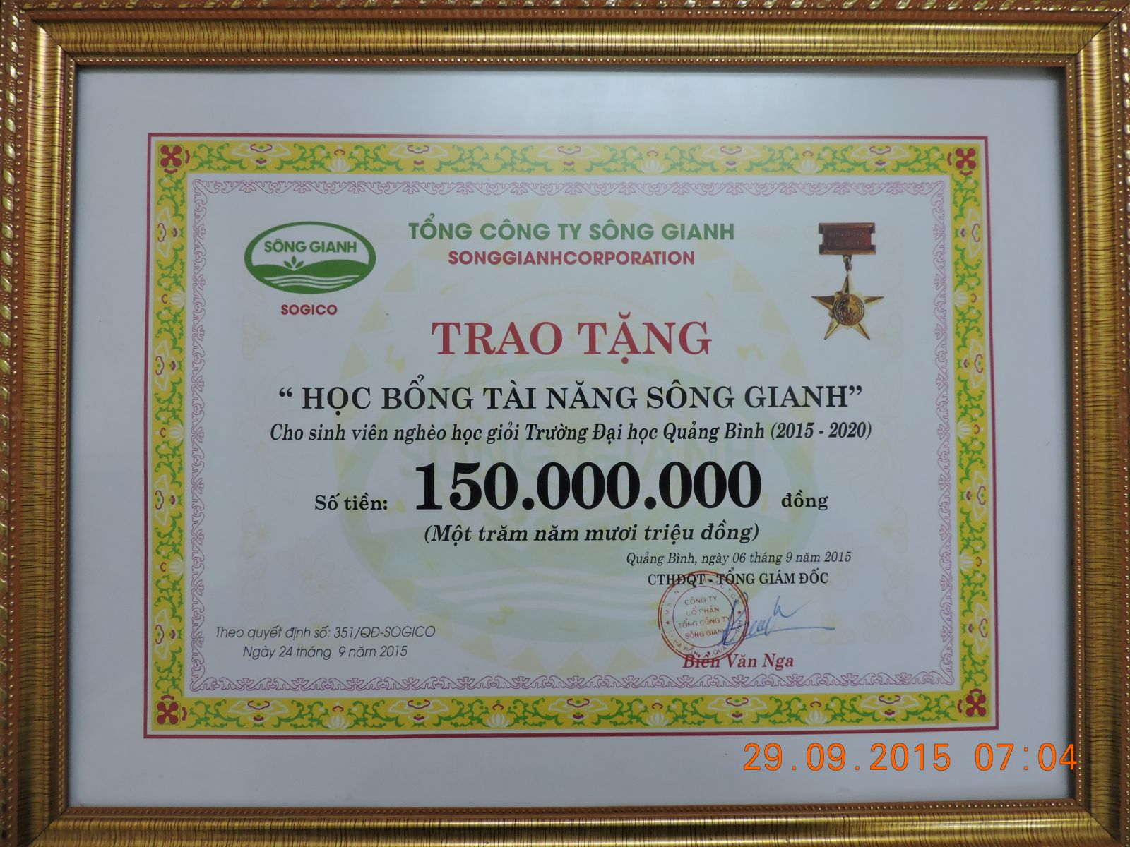 Món quà học bổng tuy không lớn nhưng sẽ giúp ích cho nhiều em sinh viên nghèo thực hiện ước mơ của mình. Sự chia sẽ của Cán bộ công nhân lao động Tổng công ty Sông Gianh sẽ song hành cùng các em trong nhiều năm (2015-2020). Tổng công ty Sông Gianh mong nhận được sự quan tâm, nhiệt tình ủng hộ, đón nhận của Nhà trường, sinh viên Đại học Quảng Bình và Lãnh đạo các cấp chính quyền tỉnh Quảng Bình.