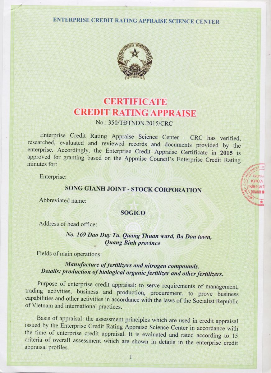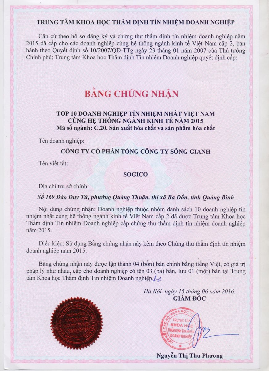 Trong năm 2015, Tổng công ty Sông Gianh đã chứng minh với các đối tác khách hàng, cổ đông trông Tổng công ty và dư luận xã hội rằng trong thời buổi khó khăn chung của nền kinh tế này và đặc biệt trong tình hình nhiều Doanh nghiệp đang bị nghi ngờ rơi vào khủng hoảng thì Tổng công ty với nỗ lực phi thường của mình đã từng bước phát triển tốt, có năng lực cạnh tranh cao trên thị trường trong và ngoài nước, có uy tín cao trong xã hội, góp phần thúc đẩy nền kinh tế Quốc dân phát triển, tồn tại phát triển bền vững. Chính vì thế, Tổng công ty Sông Gianh nhận được sự đánh giá cao từ hội đồng xét duyệt, đoàn thẩm định và đã vinh dự nhận được chứng thư thẩm định tín nhiệm doanh nghiệp và bằng chứng nhận TOP 10 doanh nghiệp tín nhiệm nhất Việt Nam cùng ngành kinh tế của Trung tâm Khoa học Thẩm định Tín nhiệm Doanh nghiệp.