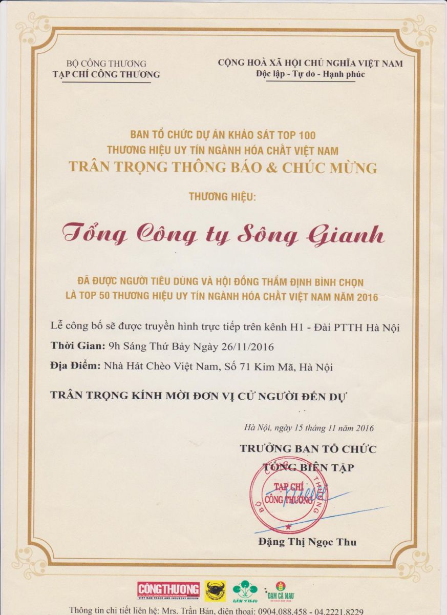 Tổng công ty Sông Gianh được người tiêu dùng và hội đồng thẩm định bình chọn là TOP 50 thương hiệu uy tín nghành hóa chất Việt Nam năm 2016