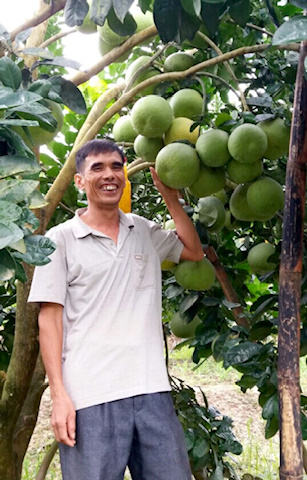 Ông Vũ Xuân Chiêm vui mừng bên vườn Bưởi sai quả của mình