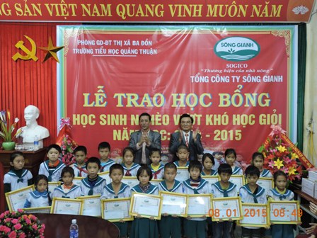 Sáng ngày 8/01/2015 Công ty cổ phẩn Tổng công ty Sông Gianh đã tổ chức lễ trao quà “Học bổng Sông Gianh” cho học sinh trường tiểu học Quảng Thuận, thị xã Ba Đồn, tỉnh Quảng Bình